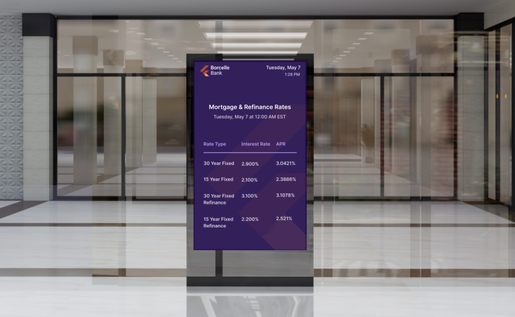 Retailr’s digital signage solutions are crafted to display mortgage rates, terms, and key information on dedicated display boards within banks. By showcasing these details, customers are offered an easy way to compare different mortgage options, guiding them to select the best choice for their needs.