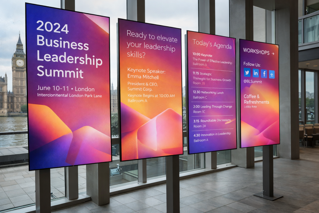 Digital signage is increasingly used to display event schedules at conferences, trade shows, and other large gatherings.